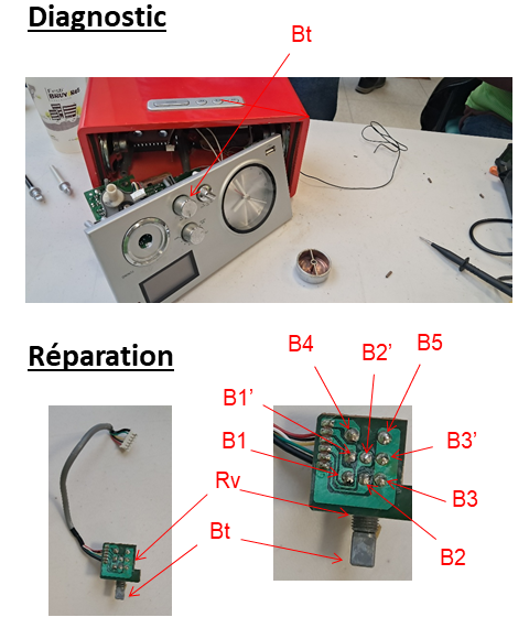 Le potentiomètre Rv est donc défaillant il faut le remplacer. NB : Ce potentiomètre Rv présente une architecture double avec des résistances variables entre B1, B2 d’une part et d’autre part entre B2 et B3 qui évoluent de façon inverse. Il en est de même entre B1’, B2’ d’une part et entre B2’ et B3 ’ d’autre part. Ce potentiomètre Rv présente aussi un bouton marche/arrêt entre les bornes B4 et B5 (lorsqu’on tourne le bouton Bt il y a une continuité entre B4 et B5 qui se coupe dans une position de butée du bouton Bt).